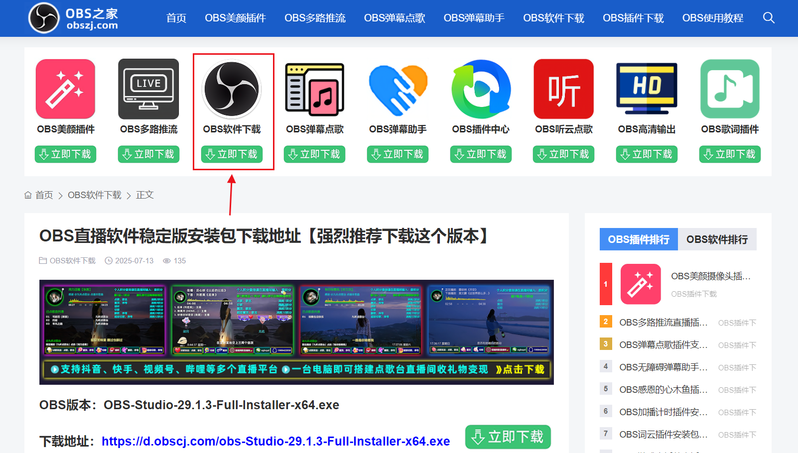 除了上述两个下载地址,还可以直接访问【OBS之家】官方网站:obszj.com 去下载,如下图所示,查看红色箭头所指的位置,然后点击绿色按钮【立即下载】即可