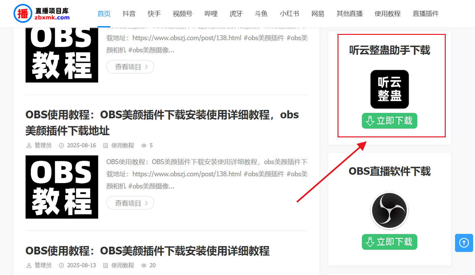 除了上述两个下载地址,还可以直接访问【直播项目库】官方网站:zbxmk.com 去下载,如下图所示,查看红色箭头所指的位置,然后点击绿色按钮【立即下载】即可